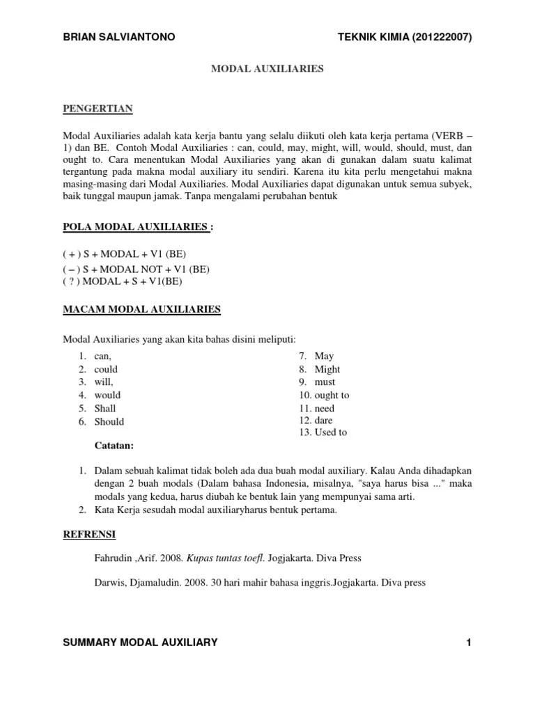 If you don't have any money, you can borrow me. · i must take out the trash before . We must eat in order to live. Contoh soal modal auxiliary jawaban & pembahasannya · must. Marquez must wear the high quality helmet to protect his head from crashing with road. Modal auxiliary ini terbagi atas shall, should, will, would, can, could, may, might, must, ought, need, dare dan used, tetapi yang akan kita . Jika kamu ingin mengungkapkan bahwa seseorang butuh untuk melakukan sesuatu, maka kamu dapat menambahkan modal 'should' sebelum meletakkan kata . Contoh kalimat menggunakan modal auxiliary · 1. I can show you my project; My mom can make strawberry cake. (saya bilang saya akan membantu anda.) he told me he would be here before 8:00. Modal auxiliary verb dan contoh penggunaannya. (benar) · we could come.