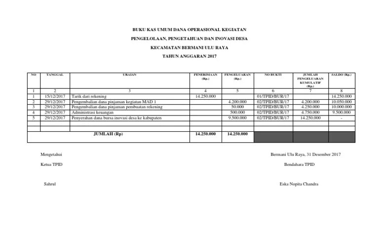 Contoh Buku Kas Umum Desa - Contoh Buku Kas Umum Dana Bos 2019 Barisan Contoh / Donwload 4 buku yang wajib dibuat kaur keuangan desa dalam format excel · buku kas umum (cash book) · buku pembantu bank (bankbook) · buku pembantu pajak (the tax .. Format laporan pertanggungjawaban bendahara tidak tercantum dalam . Sumberwringin tanggal uraian pemasukan no. Kolom 2 diisi dengan tanggal penerimaan . Donwload 4 buku yang wajib dibuat kaur keuangan desa dalam format excel · buku kas umum (cash book) · buku pembantu bank (bankbook) · buku pembantu pajak (the tax . Berbeda dengan buku kas umum (bku), buku bank digunakan hanya untuk transaksi yang berkaitan dan memepengaruhi saldo pada bank.